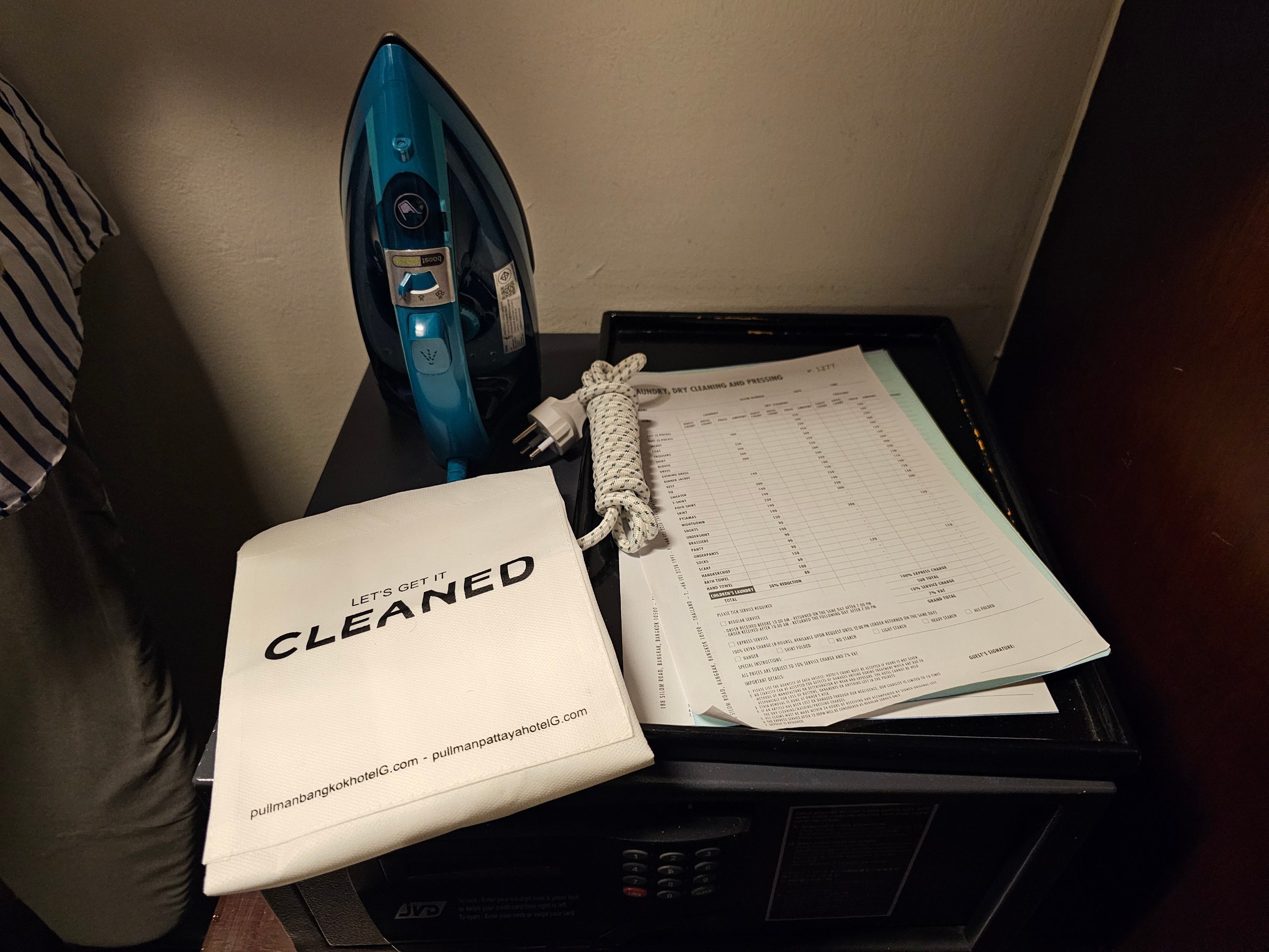 Kamar ini juga memiliki lemari pakaian yang sangat kecil, yang tidak selalu tersedia di hotel-hotel di Bangkok.