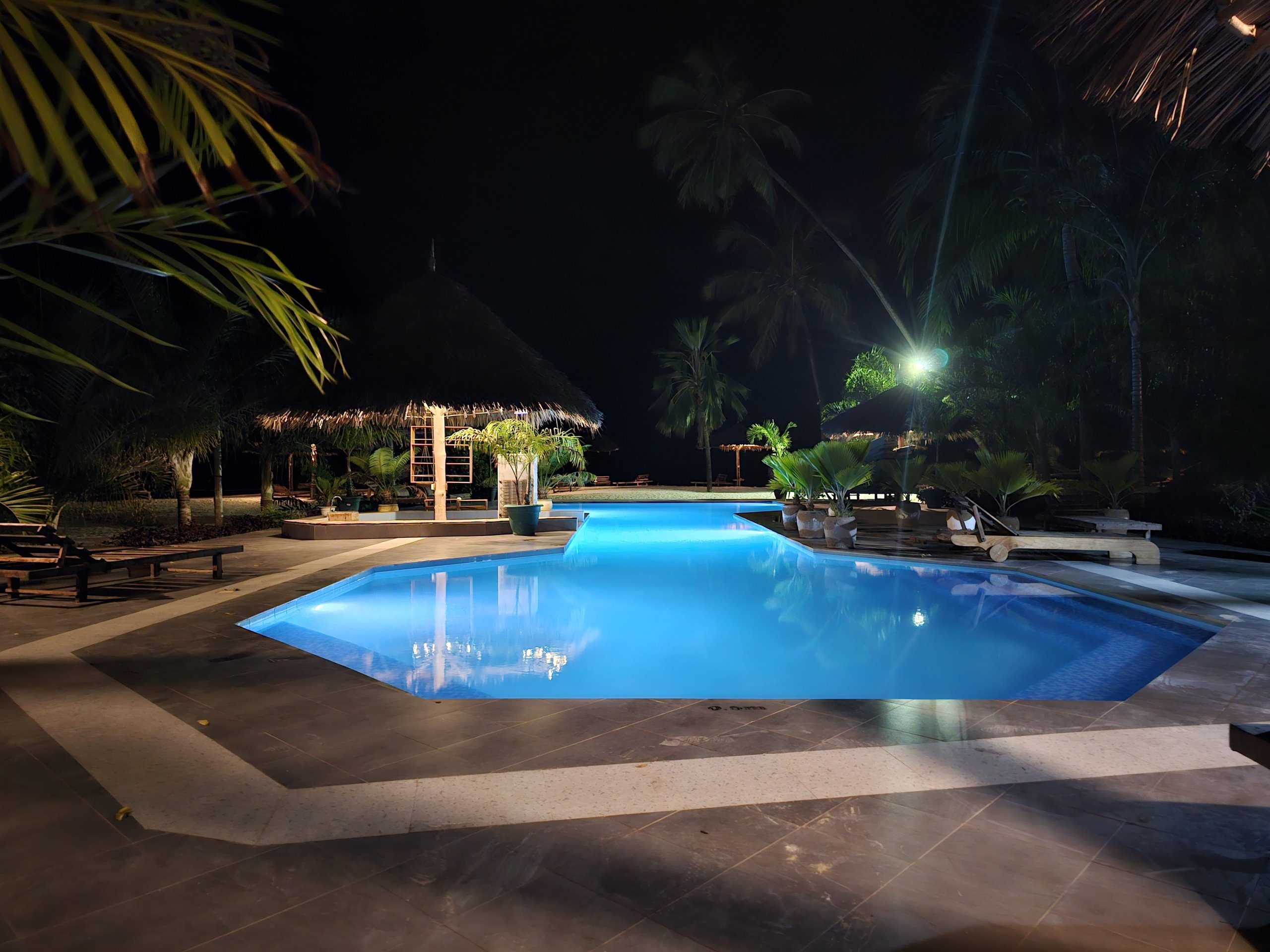 Kolam renang dapat diakses 24/7 dan diterangi dengan baik di malam hari.