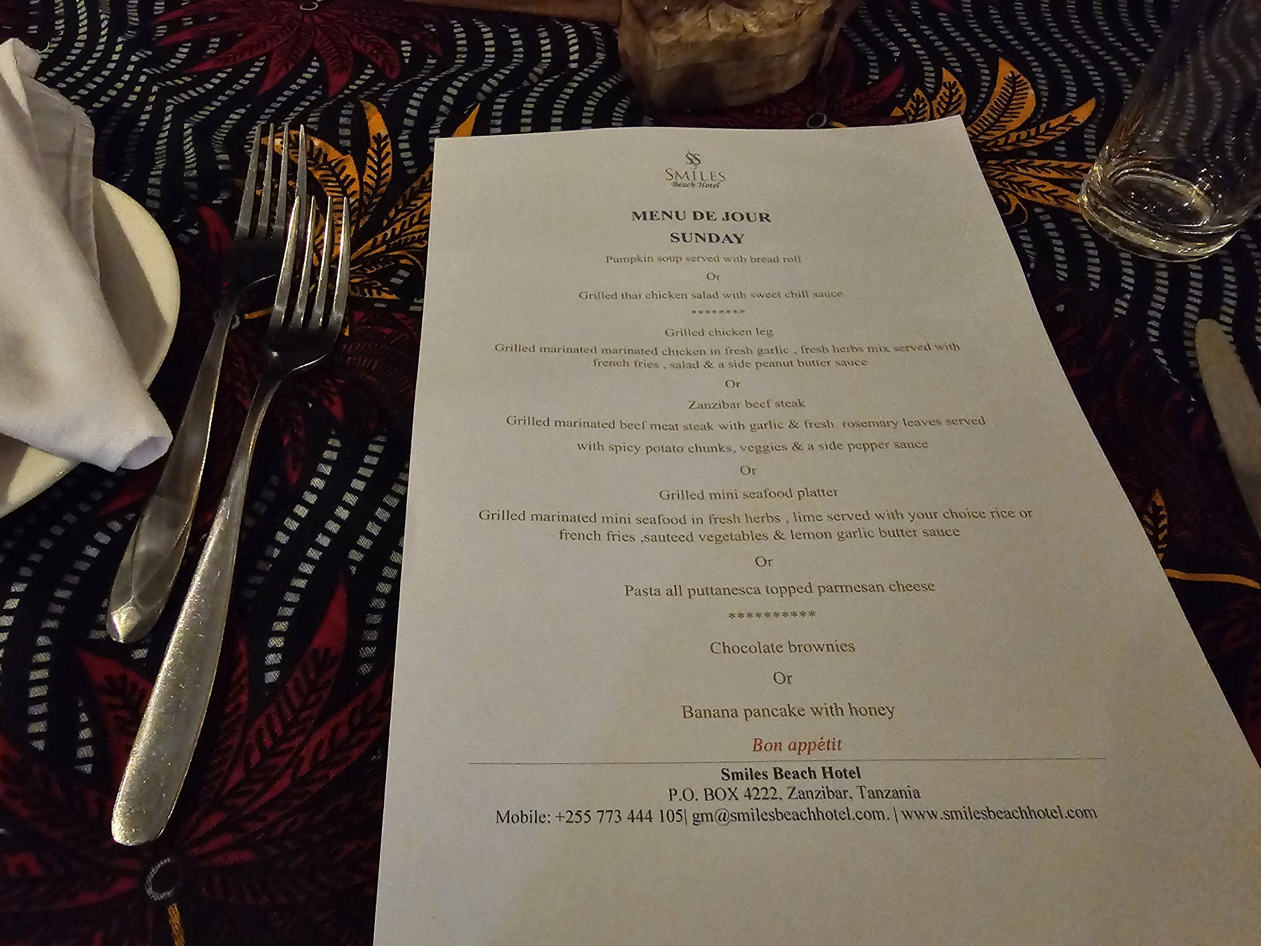 Sekilas, menunya sangat buruk, tetapi dibandingkan dengan hotel lain dalam kategori yang sama di Zanzibar, seperti Sea View Lodge di Jambiani, tempat saya pindah dari Nungwi, sebenarnya di atas rata-rata.