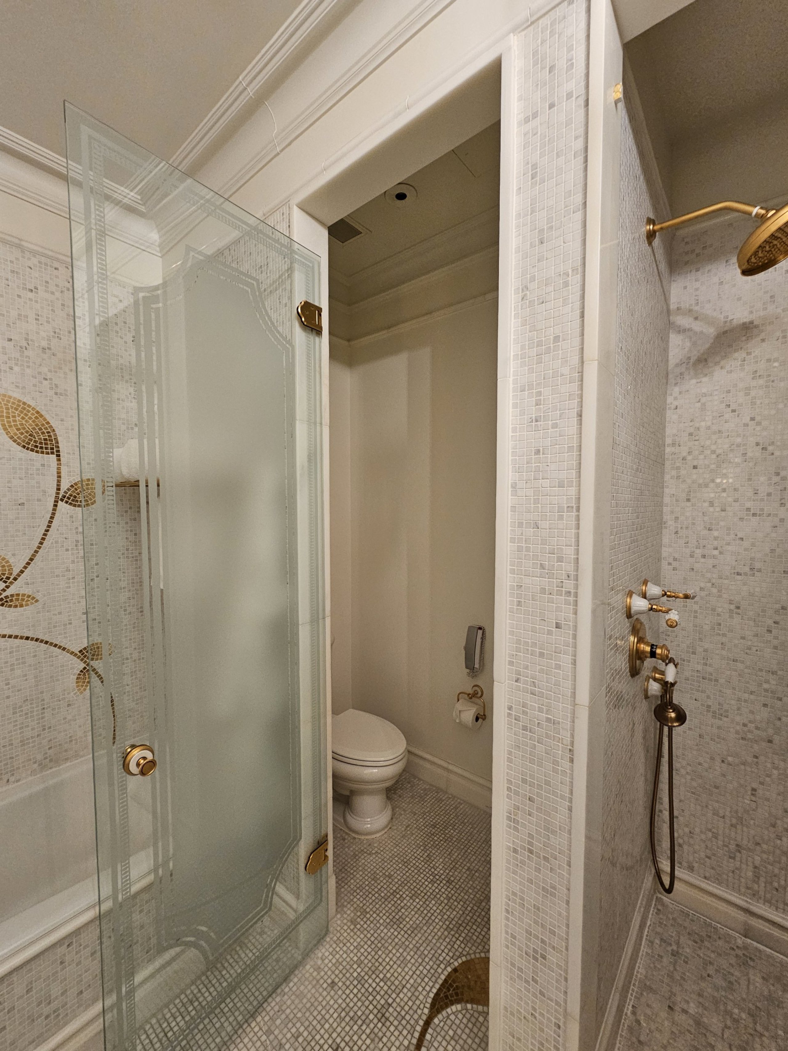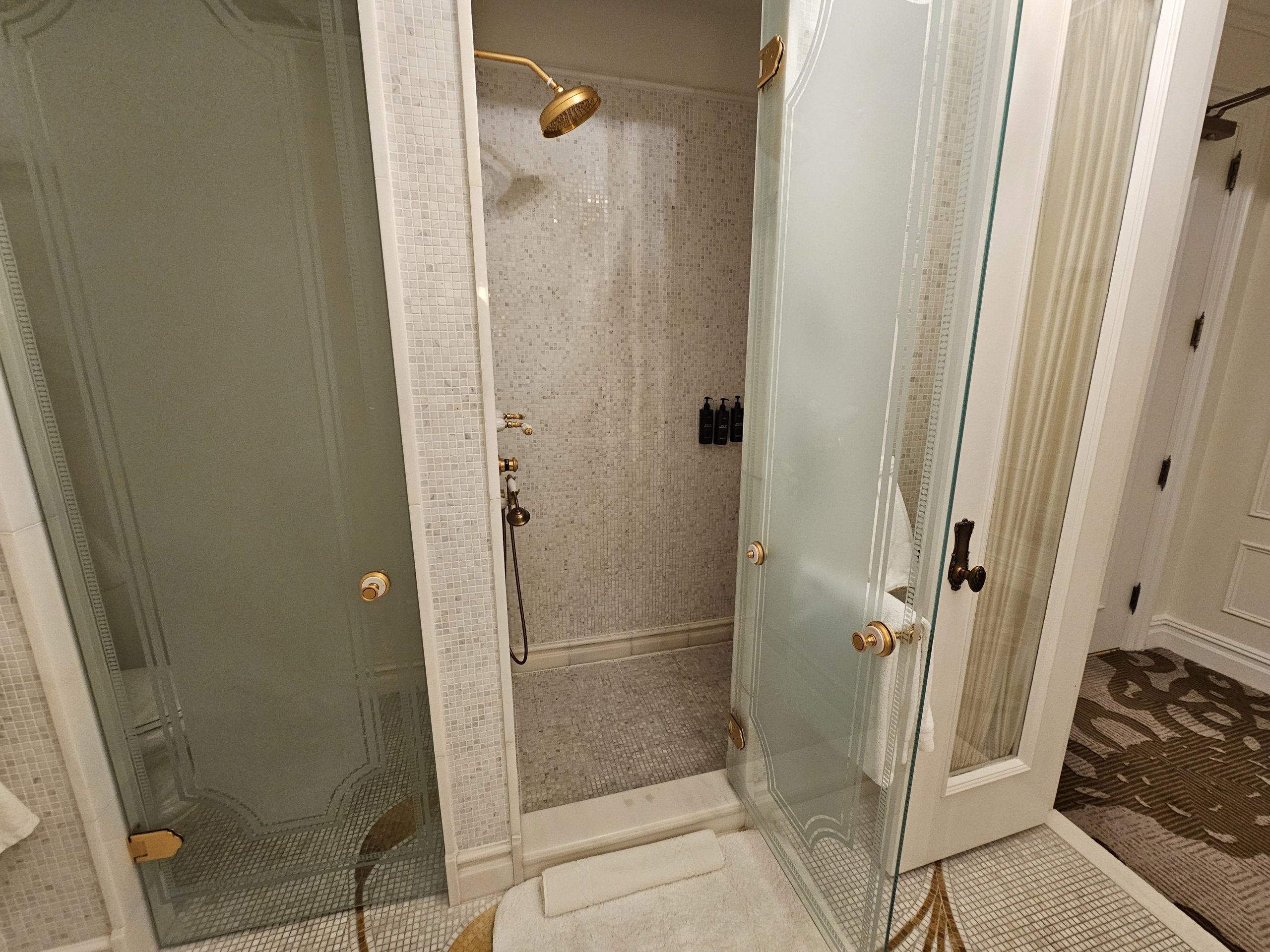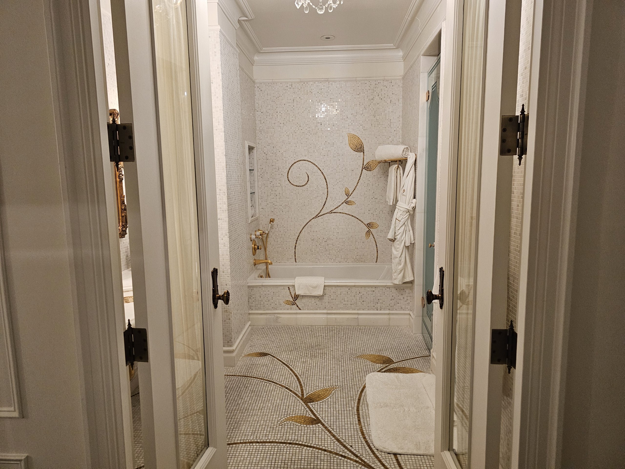Saya menghargai kamar mandi yang indah dan sangat luas dengan bak mandi, wastafel, dan dua ruang terpisah untuk toilet dan shower.