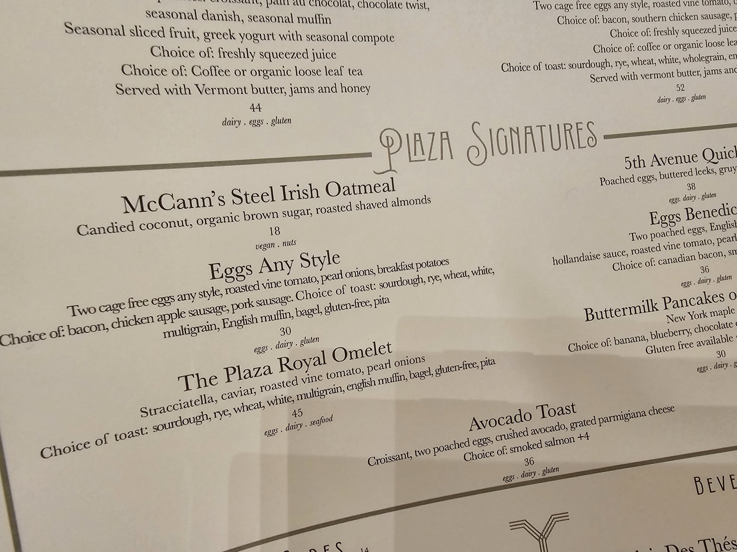 Menu termasuk beberapa jenis omelet, sarapan tradisional Amerika atau Inggris, roti bakar alpukat, telur benedict dan banyak lagi.